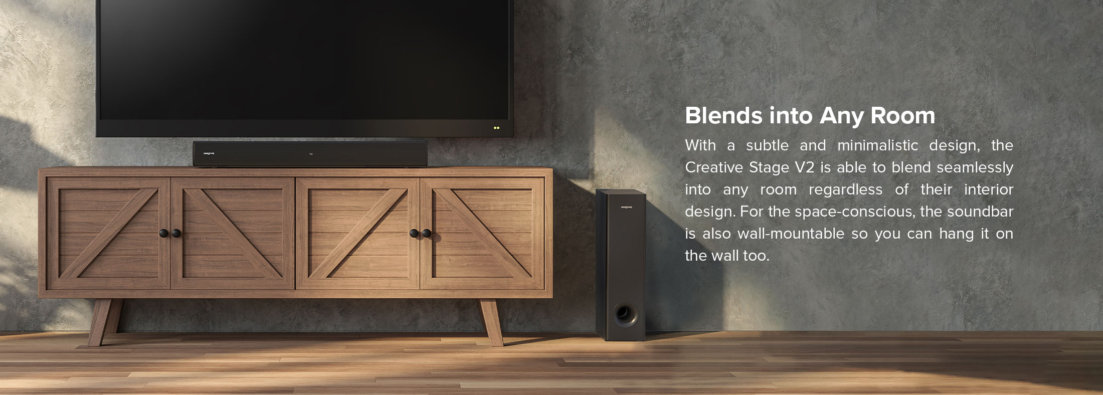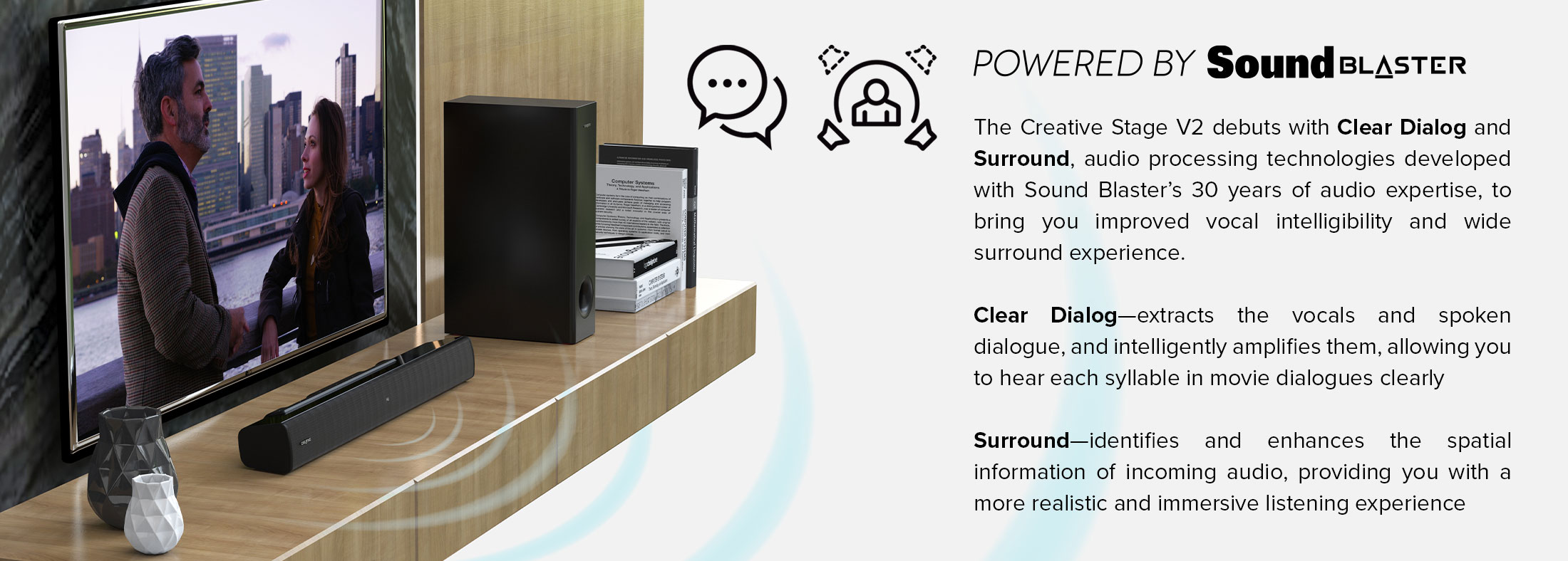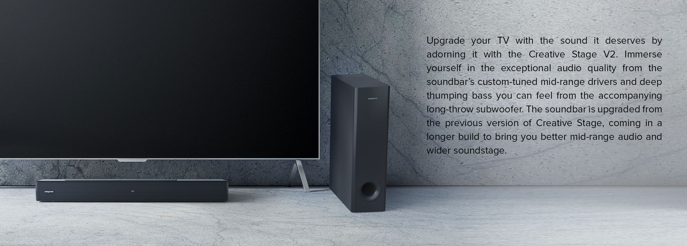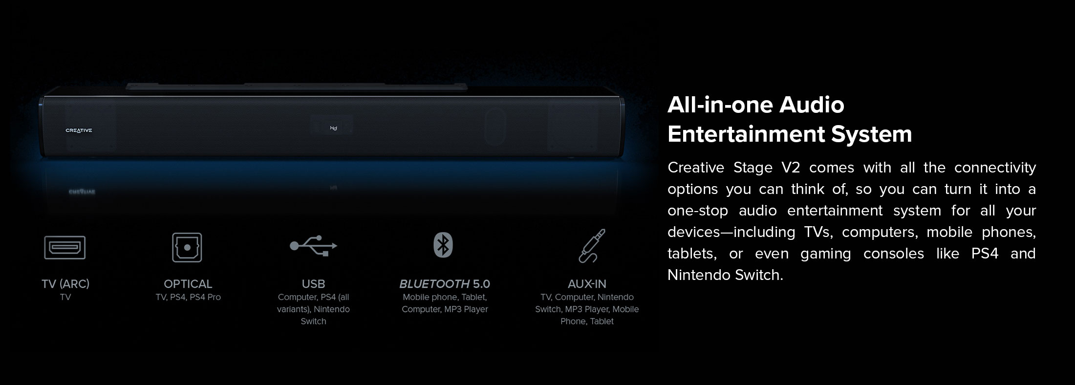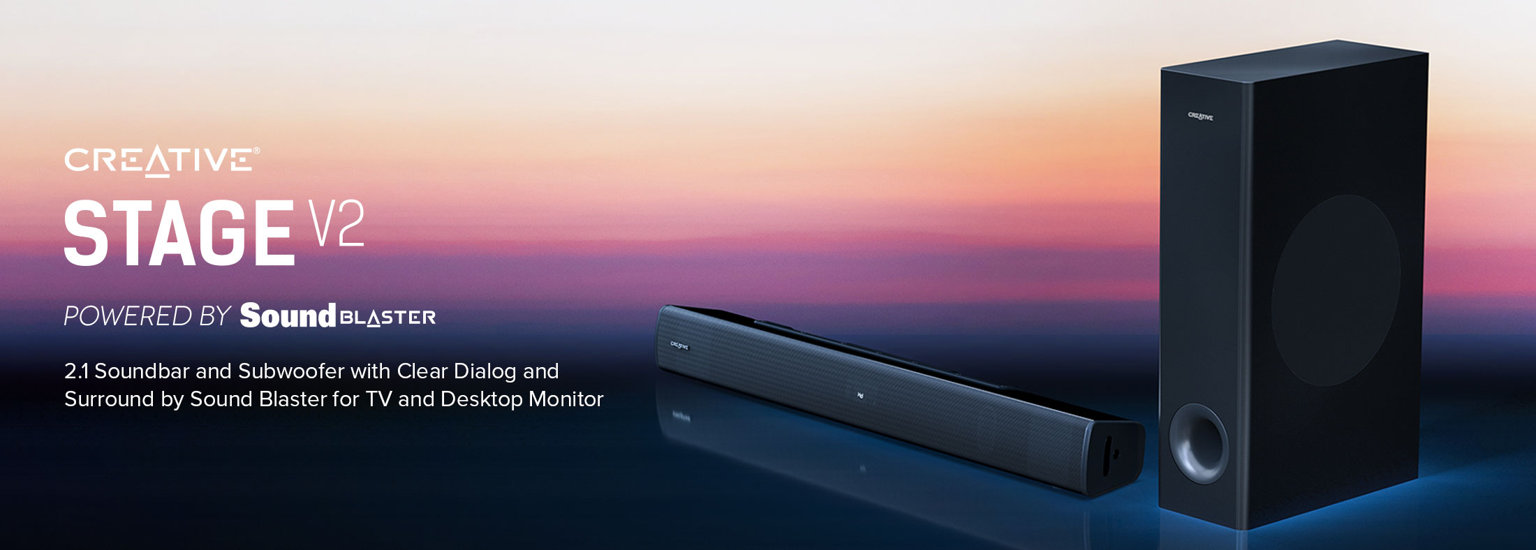Creative Stage V2 - 2.1 Soundbar with Subwoofer, Clear Dialog and Surround by Sound Blaster, Bluetooth 5.0, TV ARC, Optical, and USB Audio, Wall Mountable, Adjustable Bass and Treble, for TV