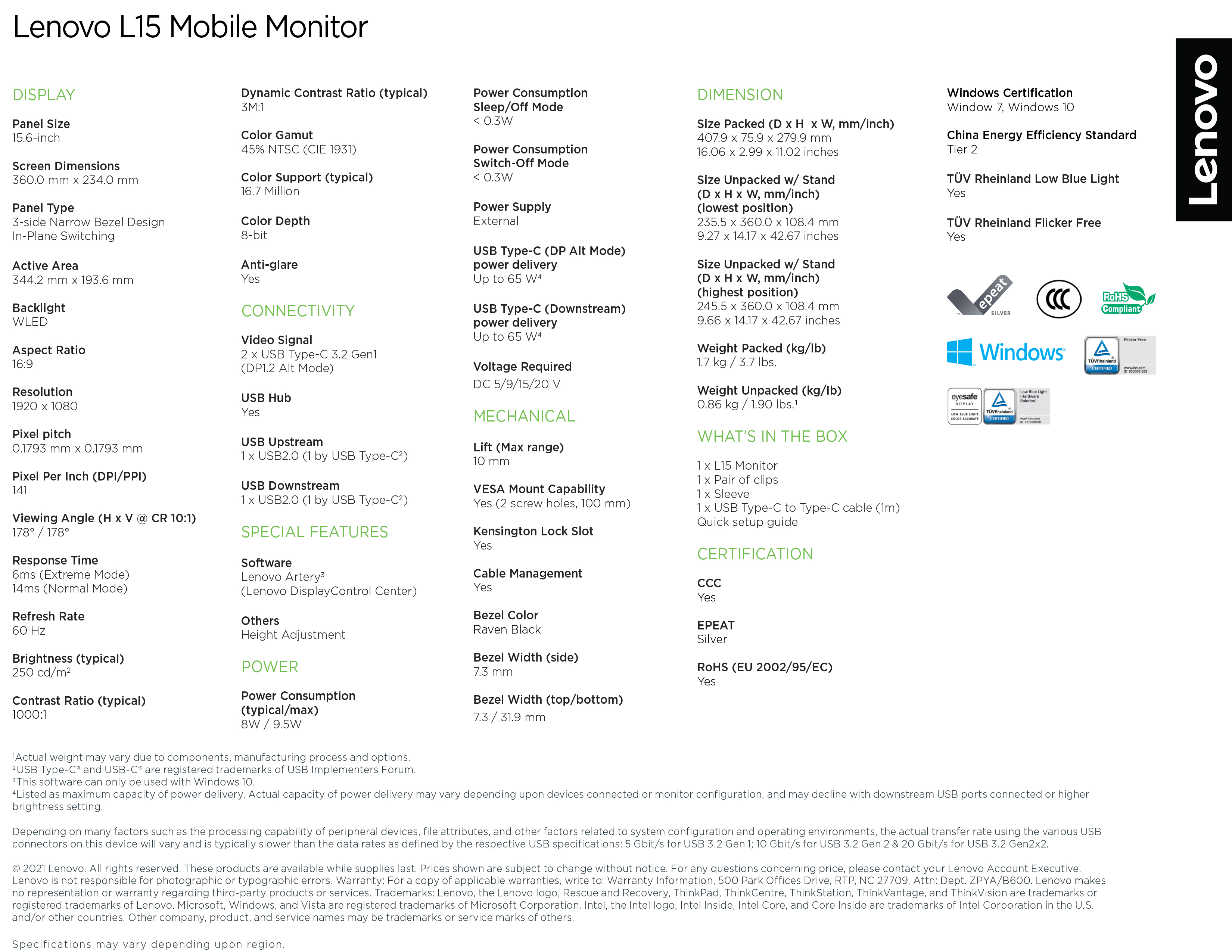Lenovo L15 Mobile Monitor | 66E4UAC1WW | 15.6" 1920x1080 60 Hz | 16:9 250 nits | 141 dpi 45% NTSC | Height Adjust Stand | 3Y Warranty