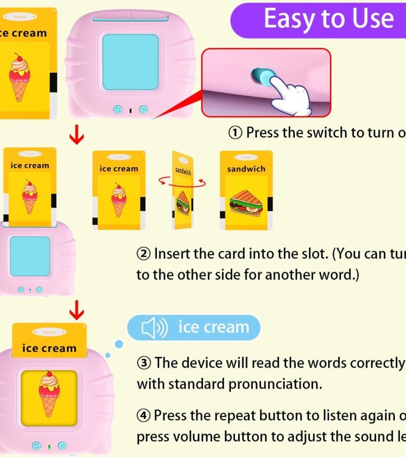 Standard pronunciation can be more helpful for children's learning, and with cute sound effects, children can remember words better. After read he words "cat", it will imitate the cat calls"meow" ,it's very interesting!