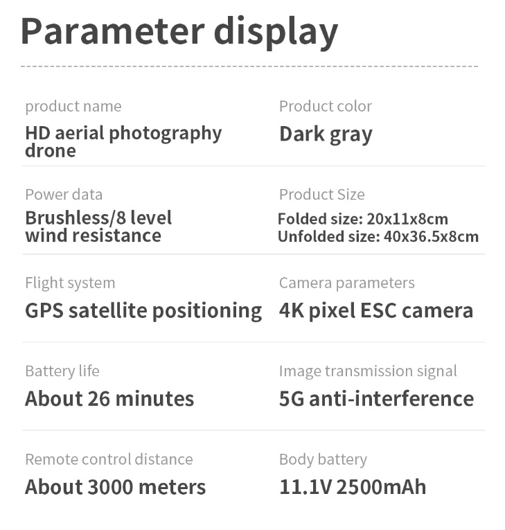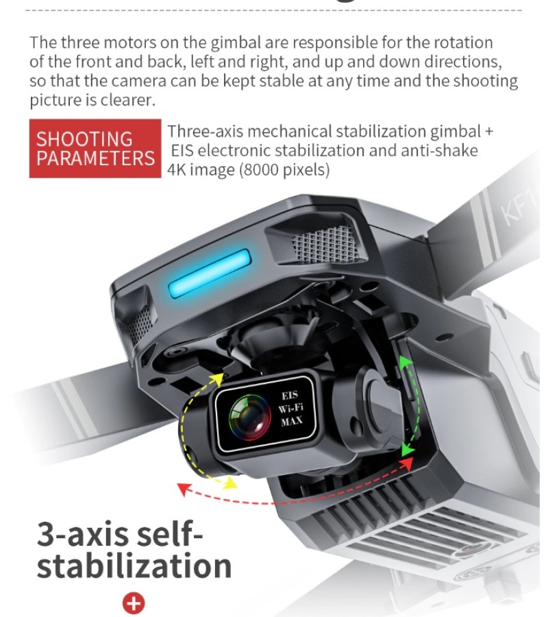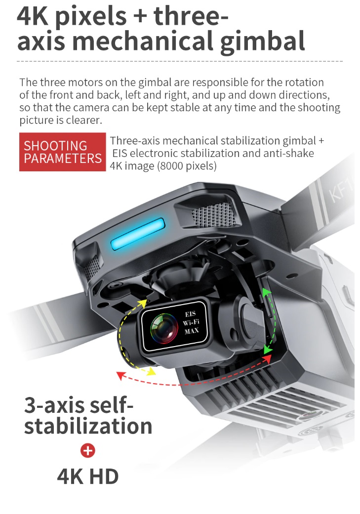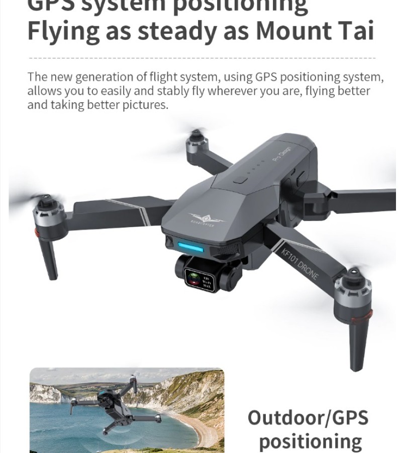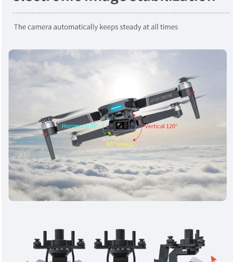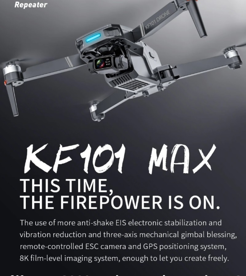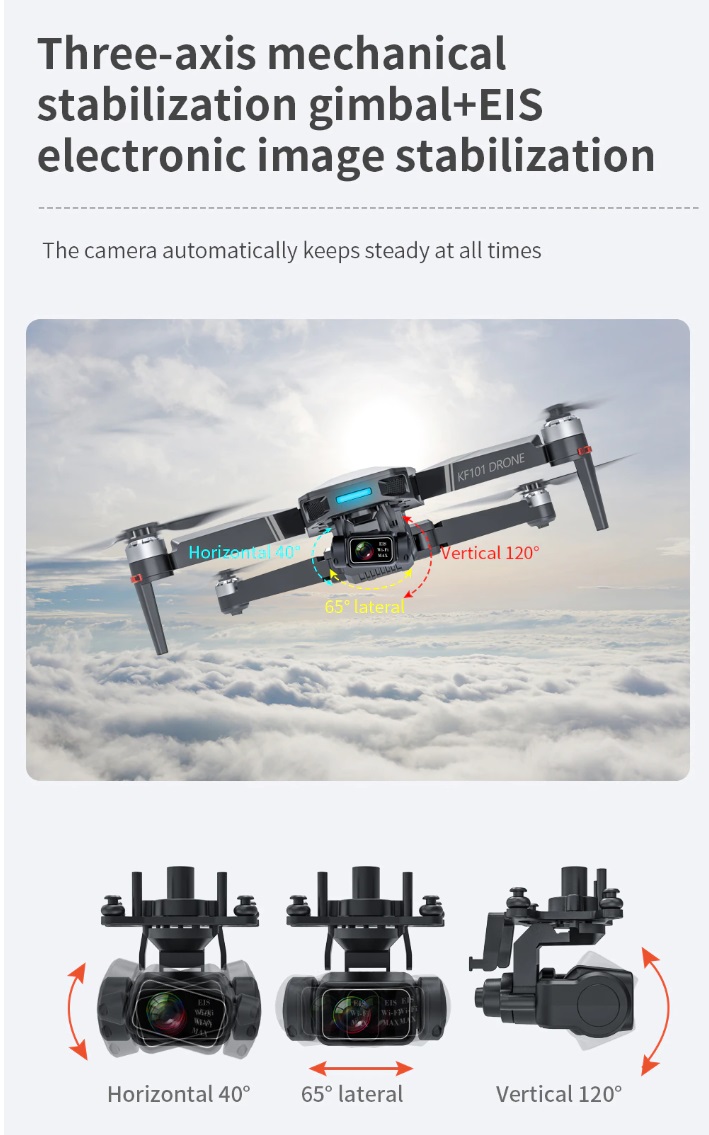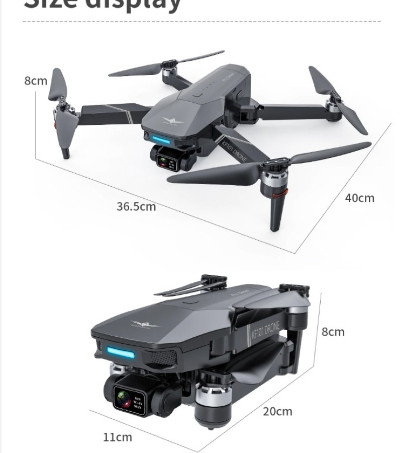 Item No: KF101 MAX Color :Dark Grey Frequency :2.4G (Remote Control) & 5G (Mobile Phone) Drone Battery :11.1V 2500mAh  Control Distance : 3KM For KF101 MAX Wifi Image Transmission Distance : 3KM  Flight Time :  About 25 min  Charging Time : About 6 hours USB Charging :  5V/2A Drone Weight : 613g (Needs drone registration in Singapore) Remote Control Battery : 3.7V 1000mAh Transmitter Charging Time : About 60min Transmitter Operating Time :  About 10 hours Camera : 3 -Axis Electronic Stabilization Gimbal EIS electronic image stabilization Camera Camera Lens :  120° Photo Resolution (APP) :  3840*2160 P Video Resolution (APP) :  1280*720 P Photo Resolution (SD Card) :  2560*1440 P Video Resolution (SD Card) :   2560*1440 P Frame Rate : 30fps Photo Format : JPG Video Format : MP4 or AVI Adjustable Angle :90° Gesture Shooting : 1-3 M GPS Follow Me :  30 M+ SD Card Supports 32G-128G(Not Included) Mobile Device System Version : iOS 8.0 or later / Android 4.4.4 or later